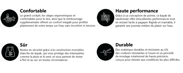 Kayak de mer spacieux et performant, idéal randonnée et week-end. Stable, rapide et confortable, avec grands compartiments étanches et dérive rétractable.